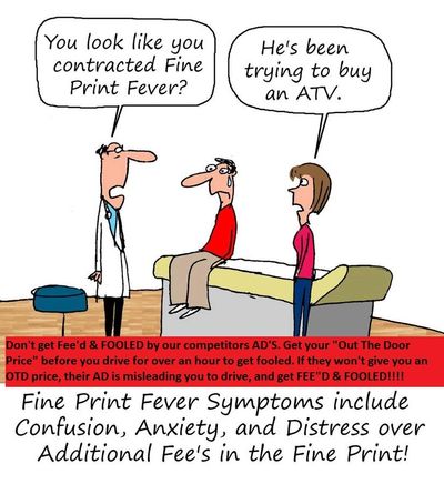 Get your OTD PRICE before you drive and set there FOR OVER AND HOUR to find this out. If they won't EMAIL or TEXT you an OTD price, their AD's FALSE.